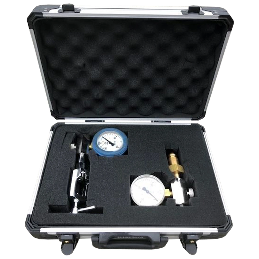 Medical oxygen cylinder tool kit in suitcase. Contents pressure gauge with Pin Index adapter and Pressure gauge with 5/8"male adapter, to check cylinder pressure contents of medical oxygen..