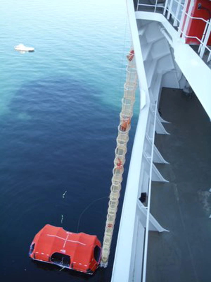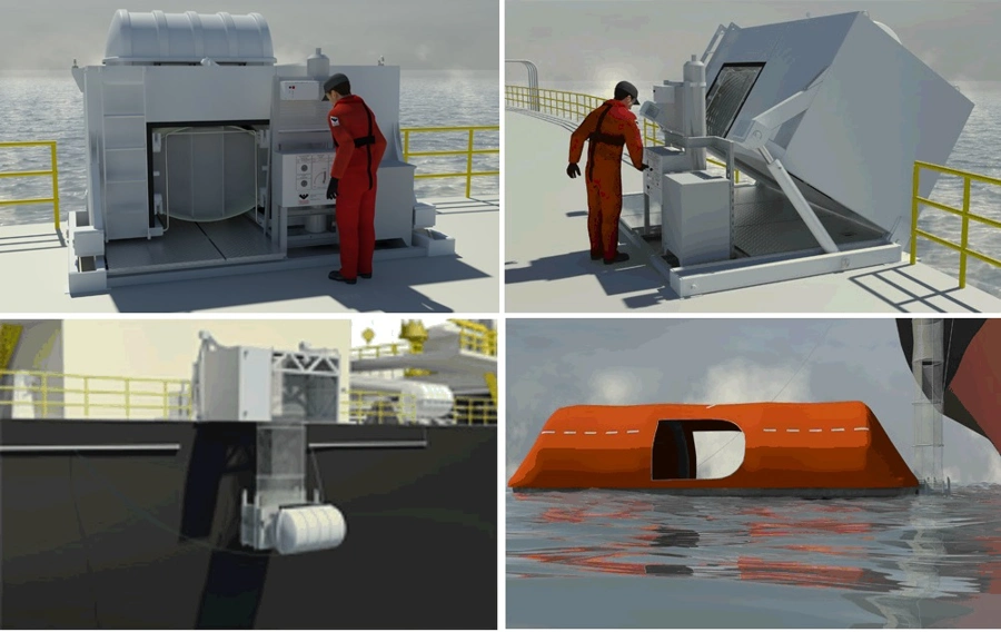 The VENOC evacuation system, installed on the deck, uses hydraulics to tilt into position for deployment. The self-righting liferaft inflates automatically at sea level, making boarding easy. No additional lines or connection points are needed.