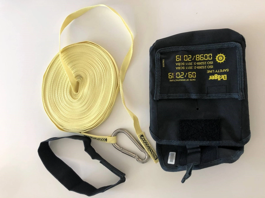 The Dräger Lifeline is a 30 m length of Kevlar line that has a karabiner with a snap-lock gate fitted on to a loop at one end.