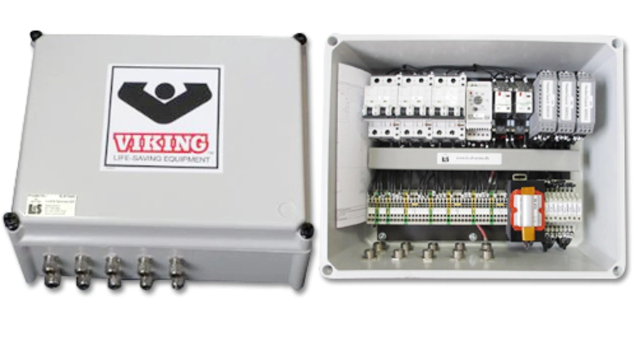 Thermal control box for three containers. The box is located near the liferafts and keeps the power supply safe. Each box supports up to three VIKING Polar liferafts. It is equipped with a temperature controlled relay, set to turn off automatically when the outside air temperature reaches above +5˚C.