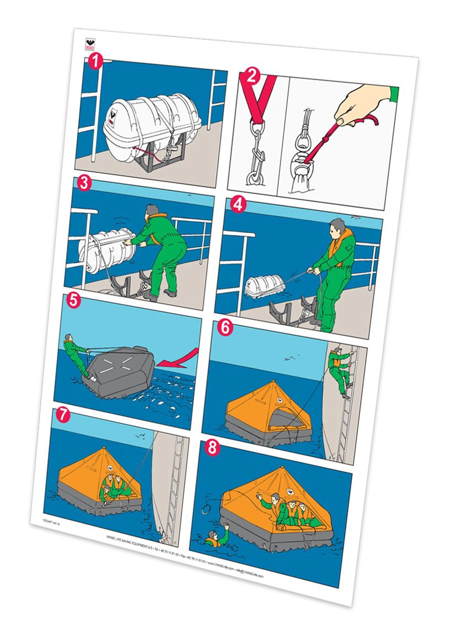 Launching instruction for cradle that fits below liferaft sizes all packed in round containers:
